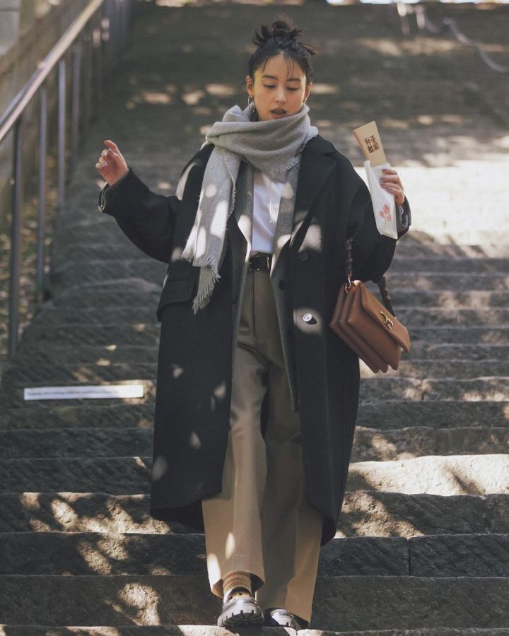 コート¥96,800(カオス/カオス丸の内)ジャケット¥46,200(FRAY I.D/FRAY I.Dルミネ新宿2店)カットソー¥18,700(サクラ/インターリブ)チノパン¥20,900(ザ シンゾーン/シンゾーン表参道本店)バッグ¥355,300ローファー¥127,600(ともにトッズ/トッズ・ジャパン)ベルト¥15,400(アルアバイル)ソックス¥1,210(靴下屋/タビオ)ピアス¥4,320(アビステ)ネックレス¥17,600(ココシュニック オンキッチュ/ココシュニック)ストール¥38,500(アソース メレ/マルティニーク ルミネ横浜)