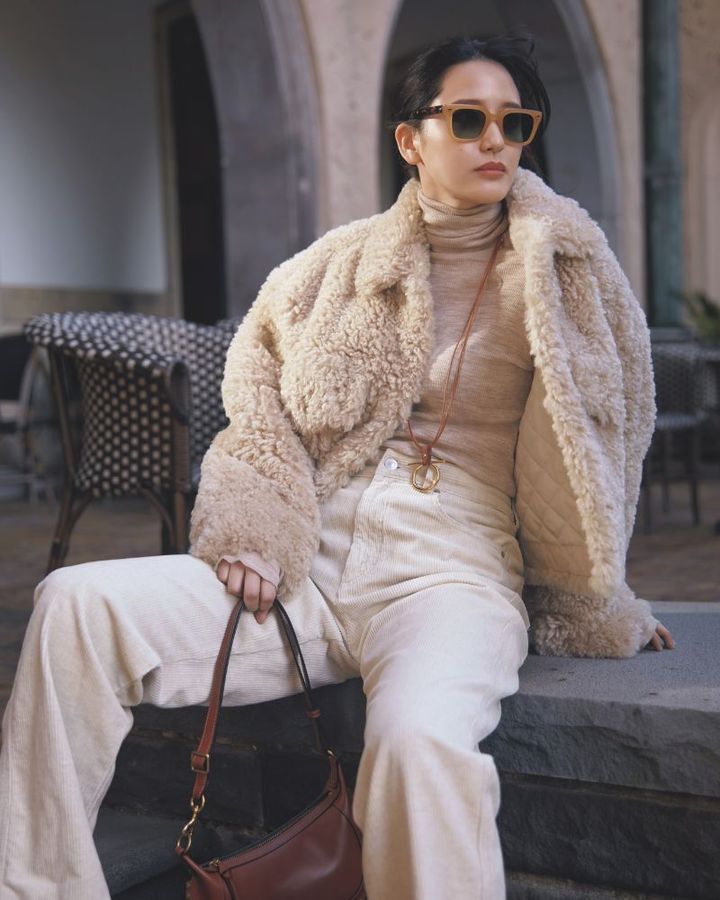 冬ならではの素材感ある「ボアジャケット」をスマートに着こなすなら、ラグジュアリーになりすぎないよう、カジュアルなアイテムを合わせるのがおすすめ。メンズライクな白パンツや女性らしいタートルニットを合わせて、バランスを調整して。「ベージュ×白×ブラウン」でトーンに濃淡をつけると、奥行きが生まれて着膨れを回避できます。ふわっと柔らかい印象をレザーの小物で引き締めて、大人のムードを出すのがポイント。