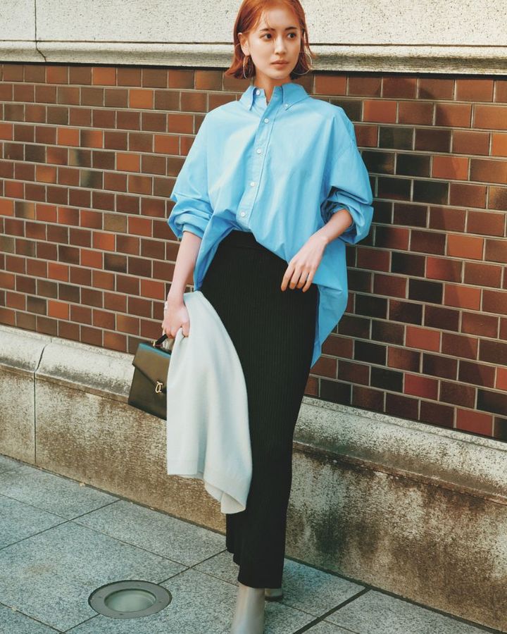 「ブルーシャツ」は通勤服の定番ですが、真面目に見えすぎてしまうという悩みも。ゆるっと余裕を持たせたビッグシルエットなら、肩肘の張った印象を上手に解決してくれておすすめ。袖をふんわりロールアップさせたり、タイトスカートと合わせれば、ユニセックスなシャツに女性らしさが備わります。後ろだけアウトして着れば、抜け感が加わり、気になるヒップ周りもカバーしてくれるので一石二鳥。