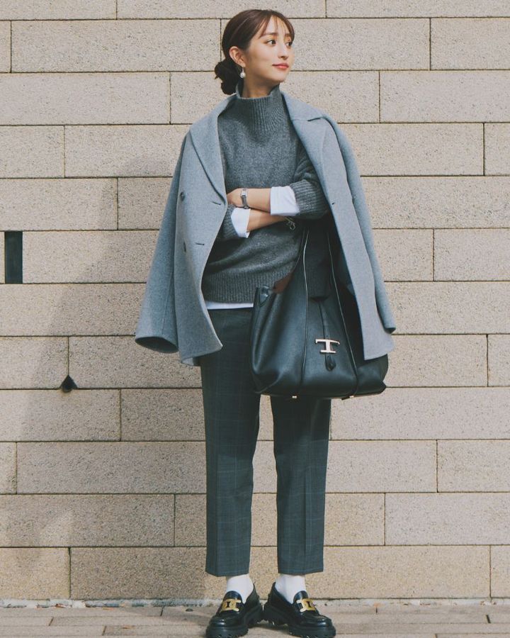 通勤服にお金も時間もかけたくない日は、やっぱり「ユニクロ」に頼りたい。カラバリが豊富なので、周りと被りにくいのが魅力のひとつです。グレーのワントーンコーデなら、きちんと感が備わり高見えと今っぽさが叶います。野暮ったくならないようTシャツやソックスで白を効かせて、抜け感を出すことを忘れずに。同系色のアウターを肩がけすれば、奥行きが生まれてこなれた表情に一変。