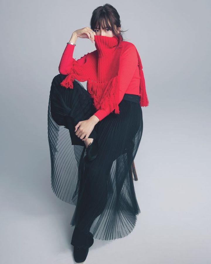 ダークトーンに頼りがちなこの時季、コーデが沈んでいませんか?そんなときは「カラーニット」をアクセサリー感覚で投入して、コーデに華やぎを。トレンドを意識するならビビッドに映える赤がおすすめです。さらに黒パンツにシアー調のスカートを重ね着すれば、コーデに奥行きが生まれて軽やかな装いに。赤と黒のドラマティックなコントラストで、周りと差をつけて。