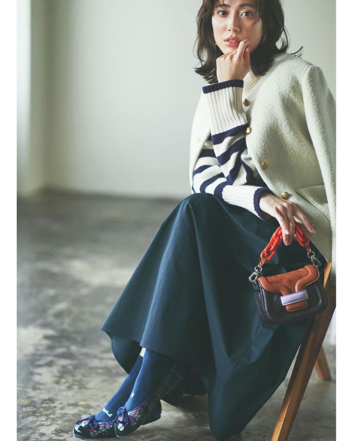 ソックス¥1,760(アニエス ベー/福助)バレエシューズ¥33,000(プリティ・バレリーナ/F.E.N.)ジャケット¥52,800(ハウント/ハウント代官山/ゲストリスト)ボーダーニット¥18,920(アルページュストーリー/アルページュストーリー プレスルーム)スカート¥17,600(HeRIN.CYE/バロックジャパンリミテッド)バッグ¥143,000(ピエールアルディ/ピエール アルディ 東京)ピアス¥25,080(エムシー・スタジオ/ZUTTOHOLIC)