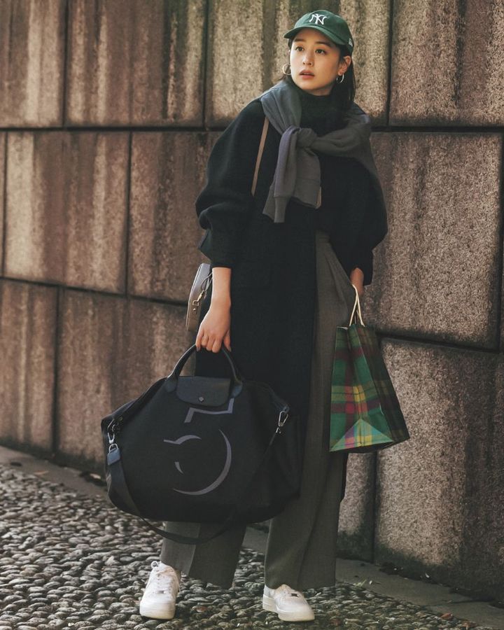コート¥96,800(カオス/カオス丸の内)タートルニット¥2,990(UNIQLO)スウェット¥13,200(カデュネ/カデュネ プレスルーム)パンツ¥23,980(ネイヴ)ショルダーバッグ¥37,400(ヴァジック/ヴァジックジャパン)トラベルバッグ¥46,200(ロンシャン/ロンシャン・ジャパン)スニーカー¥15,400(ナイキ/NIKE カスタマーサービス)キャップ¥4,400(ニューエラ)イヤリング¥8,640(アビステ)ネックレス¥29,700(アダワットトゥアレグ)