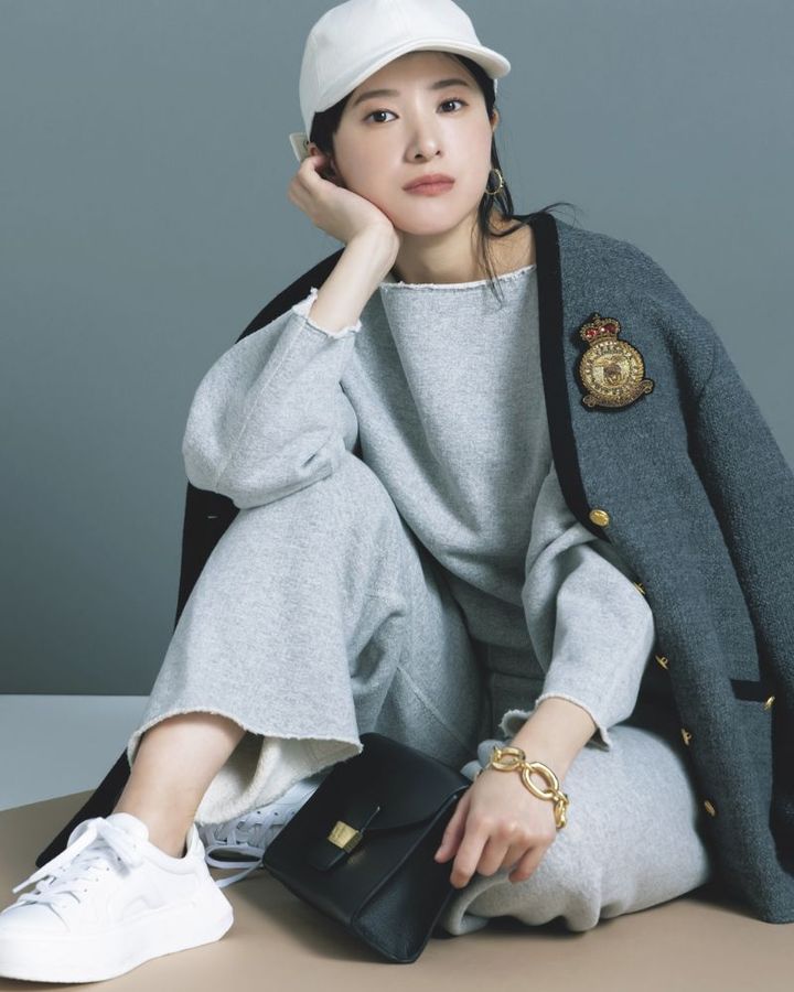 着回し力抜群のグレースウェットは、キレイめなアウターとも好相性の頼れる名品。かっちりめのカーディガンを合わせてクラシカルさを演出すれば、手抜きに見えず街で浮きません。ゆったりしたスウェットのセットアップを、ゴールドのアクセサリーやレザーバッグで大人っぽく引き締めて。仕上げに白のスニーカーやキャップを投入し、クリーンにカジュアルアップさせるのがコツです。