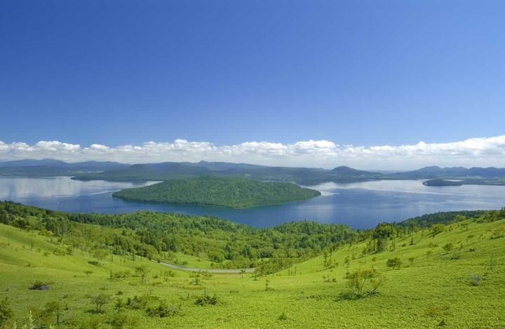 「洞爺湖」は、北海道南西部にある円形に近いカルデラ湖です。周囲約43km、水面標高約84m、最深部約179.7m、最大透明度約10mで、約11万年前の噴火により誕生。湖の中央には、大島、弁天島、観音島、饅頭島の4つの島(総称:中島)が浮かんでいます。
