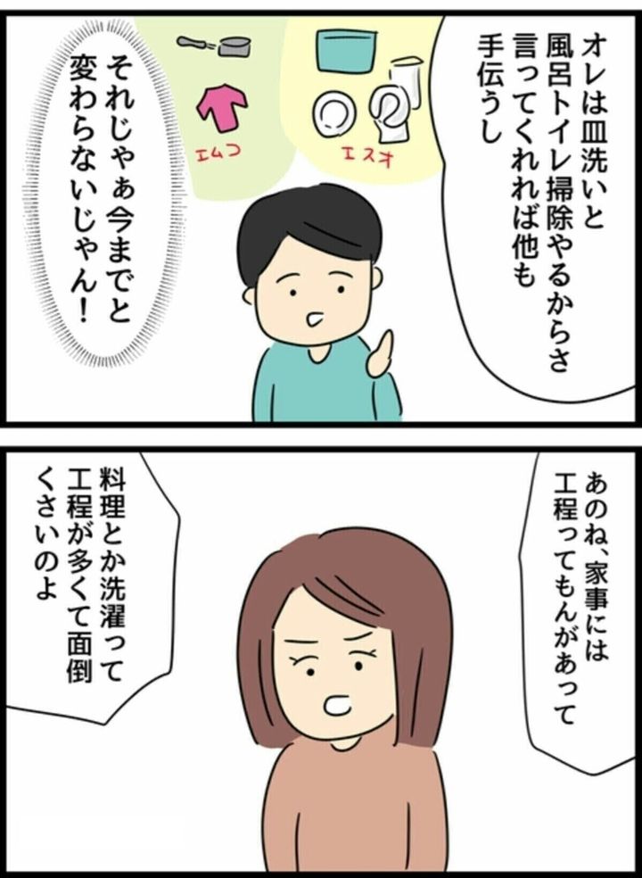 しかし、エスオ君は少しずつ機嫌が悪くなり、家事のやり方について反論をし始め、結局話し合いは平行線に…。