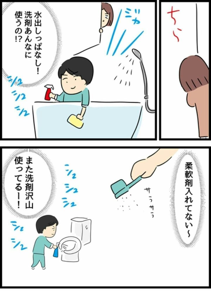 ほかにも、お風呂やトイレの掃除、洗濯などの家事を積極的にやってくれるエスオ君でしたが、エムコちゃんはそのどれもに不満が募ってしまい、ちゃんとしたやり方を覚えてもらうために話をすることにしました。