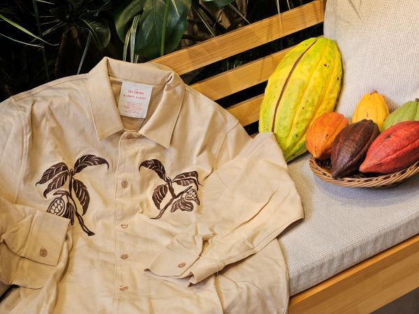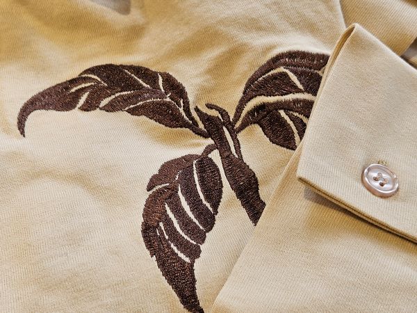 刺繍でカカオの風合いを表現しています。優しい色合いと肌触りがとても心地よいです。