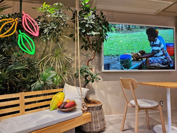 カカオの農園の様子もディスプレイの映像で流れていました。ぜひ注目してみてくださいね。