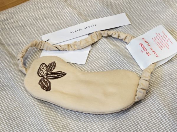 「DO Cacao ×SLEEPY SLEEPYCacao Eye mask」 5,000円 「アイマスク」は、昨年朝日小学生新聞の「カカオハスクアイデアコンテスト」の佳作になった「アイマスクシート」を参考にしており、子どもたちのアイデアを具現化した最初の商品です。