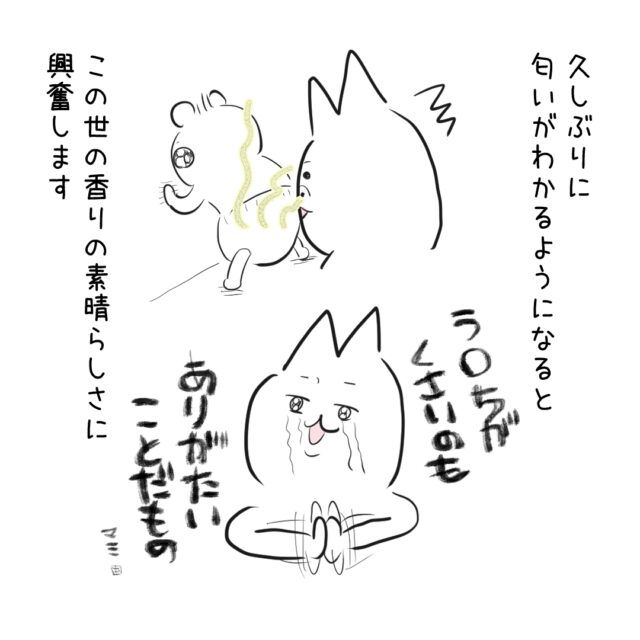 小学2年生の女の子こねたんと、2歳の女の子いもたんのママであるマーミーさんから、匂いのお話です。鼻炎で匂いがわからなくなることが多いマーミーさん、匂いがわかるときに試してみたいと思っていたものがあって・・・。