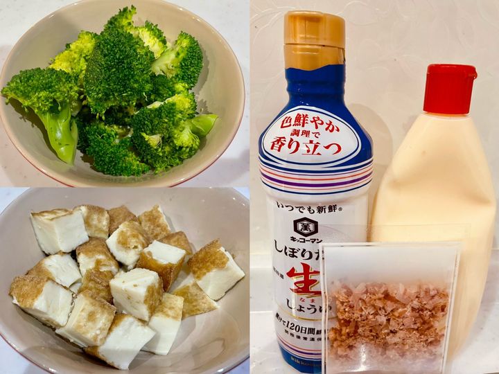 3.ブロッコリーと厚揚げをボウルに入れ、おかか・マヨネーズ・醤油を入れて混ぜます。