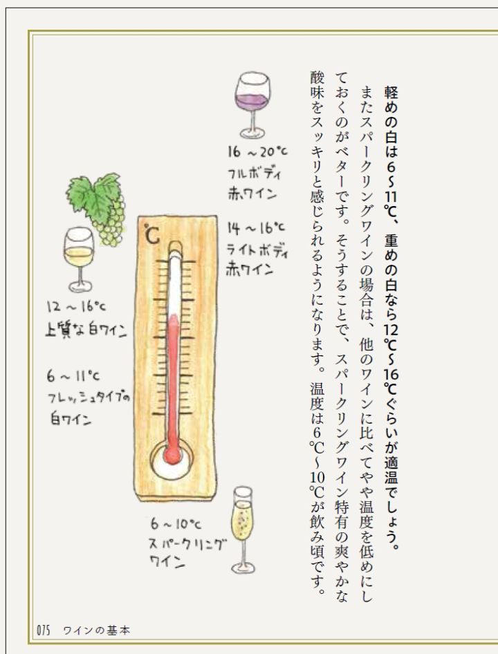 Tamyさんの新刊「世界一おいしいワインの楽しみ方」(三笠書房/知的生きかた文庫)では、上記のような目安のほか、温度による味わいの違い、季節ごとの冷やし方のコツなども紹介していますのでぜひチェックを。