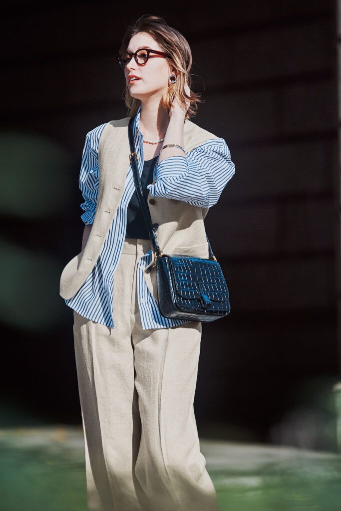タンクトップ×ストライプシャツ×ジレのレイヤードでオフィカジにも抜け感を。ジレ※着回し パンツ¥28,600(ジャーナル スタンダード レサージュ/ジャーナル スタンダード レサージュ 丸の内店)シャツ¥72,600(マリア マクマナス/ロンハーマン)タンクトップ¥13,200(サクラ/インターリブ)バッグ¥209,000(J&M デヴィッドソン/J&M デヴィッドソン カスタマーセンター)メガネ¥42,900(モスコット/モスコット トウキョウ)ピアス¥27,500(ウノアエレシルバーコレクション/ウノアエレ ジャパン)ネックレス¥22,050バングル[2本セット]¥4,860(ともにアビステ)