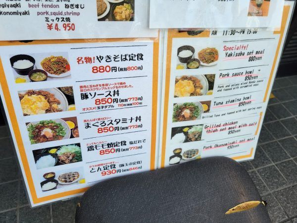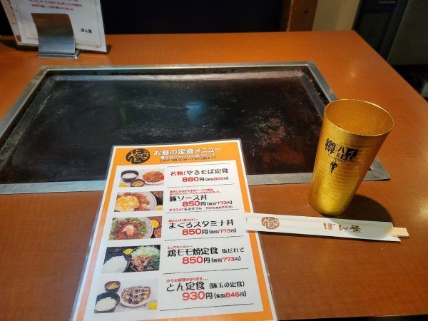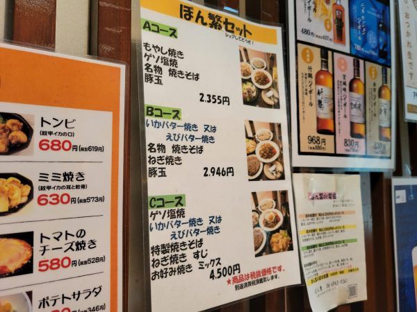 壁には色々なメニューの情報が貼ってあって、ぼん繁セットのA・B・Cコースが気になりました。そこに書いてあるゲソ塩焼、いかバター焼きがおいしそうです!店員さんに聞けば、単品メニューもOKということなので、いか入りのやきそばとランチの豚ソース丼をいただくことにしました。