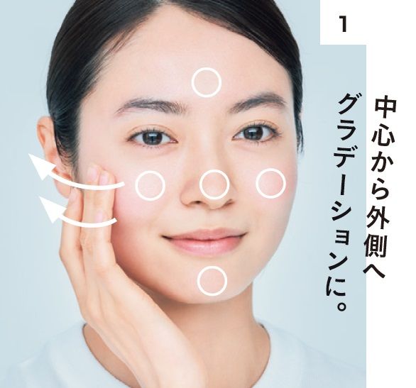 1、下地を適量手に取ったら、額、両頬、鼻、顎の5点にのせ、中央から外側へ向けて広げる。中央が一番明るくなるように。