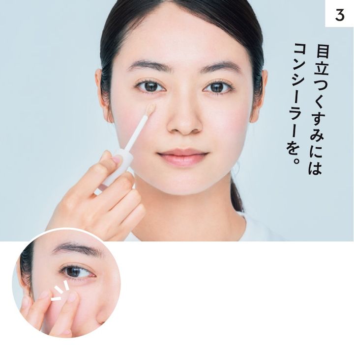 3、クマなどのくすみはコンシーラーでカバー。気になる部分にチップで少量ずつ点置きし、指で軽くなじませる。