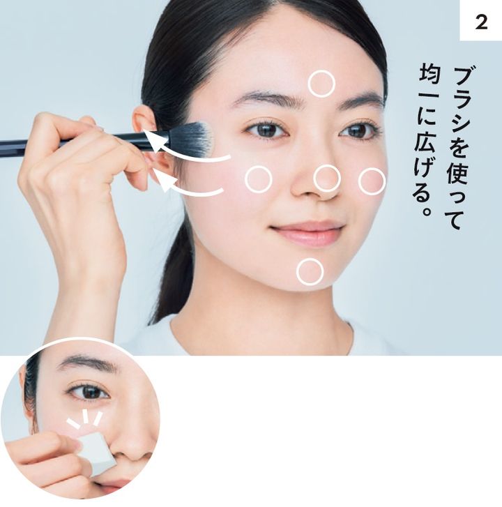 2、ファンデーションも5点置きし、内から外へ均一にのばす。立体感が透けるようにブラシで薄膜に。細かい部分はスポンジでFIX。