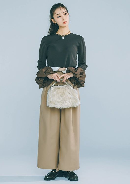 ベルスリーブニット¥15,950/カデュネ パンツ¥20,900/Stola. イヤリング¥48,400/アナプノエ、ネックレス¥18,700/イン ムード(ともにフォーティーン ショールーム) バッグ¥40,700/ジャンニ キアリーニ(ジャンニ キアリーニ銀座店) ローファー¥45,100/ファビオ ルスコーニ(ファビオ ルスコーニ ジェイアール名古屋タカシマヤ店)