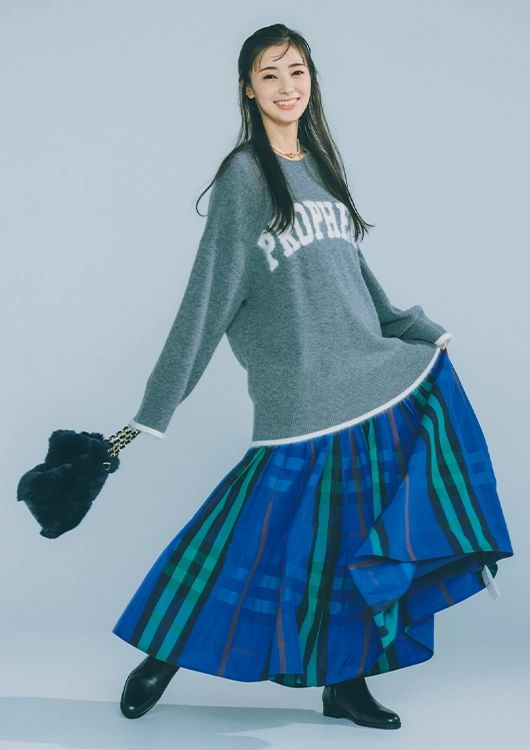 ロゴニット¥25,300/カデュネ チェック柄スカート¥24,200/アルページュストーリー ネックレス¥5,800/ルナシック(ロードス) バッグ¥13,750、ショートブーツ¥26,400/ともにダイアナ(ダイアナ 銀座本店)