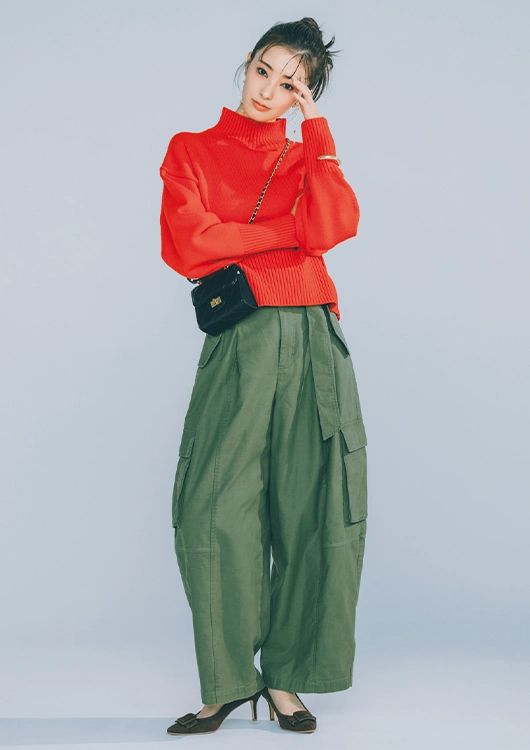 ニット¥4,389/ロペピクニック カーゴパンツ¥25,300/ルーニィ イヤリング¥3,630/mimi33(サンポークリエイト) バングル¥13,750/Hh(フォーティーン ショールーム) バッグ¥2,790/神戸レタス パンプス¥18,700/ダイアナ(ダイアナ 銀座本店)