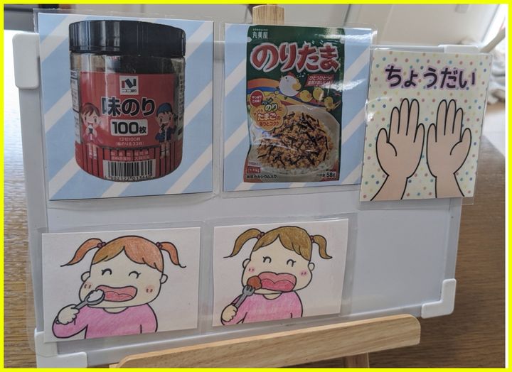 欲しい食べ物(例→「ふりかけ」「ちょうだい」のPECS)を選んで