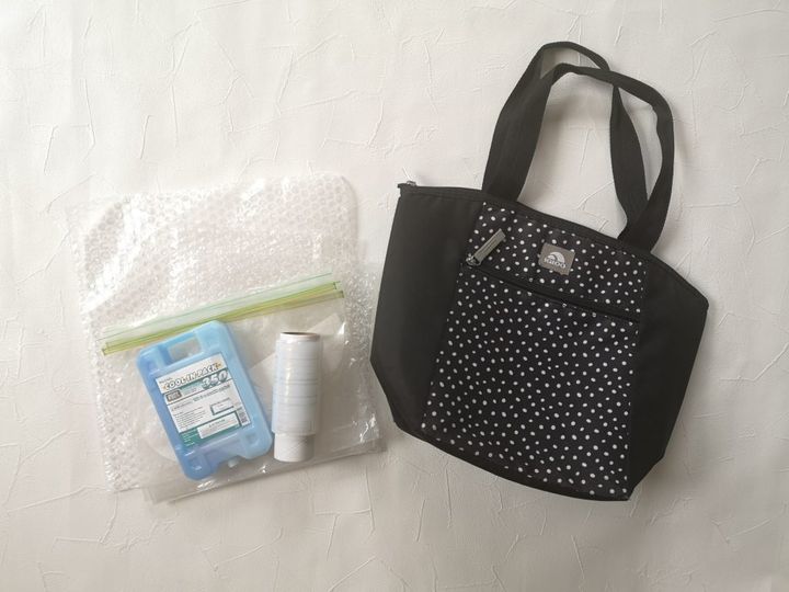 今回は食材を買う! というときは、高機能保冷バッグや保冷剤、緩衝材とジップ付き袋などを持参します。高機能保冷バッグは厚みがある分かさばりますが、その分機能面はバッチリ。生ものも安心して持ち帰れています。緩衝材は瓶入り調味料やジャムなどを包むのに使っています。
