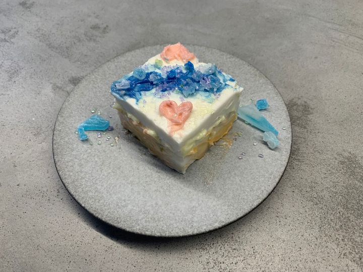 完成したケーキがこちらです! 可愛いケーキを作りたい気分だったので、ハートを描いてみました♡ 味もおいしく、楽しさも感じられる一品でした。キャンバスケーキは日によってすぐに売り切れるので、予約推奨です!