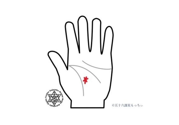 図のように、3から4本の短い線が交差している小さな模様を、手相の世界では「スター」と呼びます。このような線は幸運の印とされています。細かな意味合いは、これがどこにあるかによっても変わってくるのですが、中指の直下にある場合を除いて、全て良い意味を持っています。