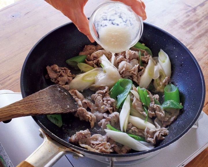 シンプルな炒めものも、塩麹で味つけすればぐっと深い味わいに! 肉200gに対し、塩麹大さじ1強(約25g)が目安です。肉をねぎや、にんにく、しょうがなどの香味野菜とともに炒めたら、塩麹を加えて。酒少々で風味を加えても。