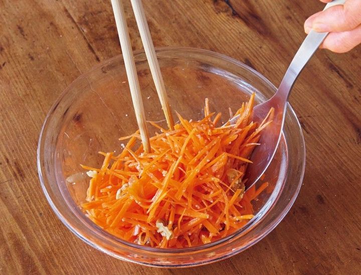 塩麹と酢各大さじ1、オリーブオイル大さじ2、こしょう適宜を混ぜれば、野菜のうまみをダイレクトに味わえる塩麹ドレッシングの完成。キャロットラぺはもちろん、コールスローやグリーンサラダでも。