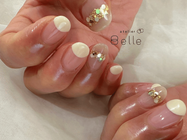 【最強ネイル!】デートにもおすすめ!アイボリー×キラキラに勝るものなし!丸フレンチで可愛さもお墨付き!
