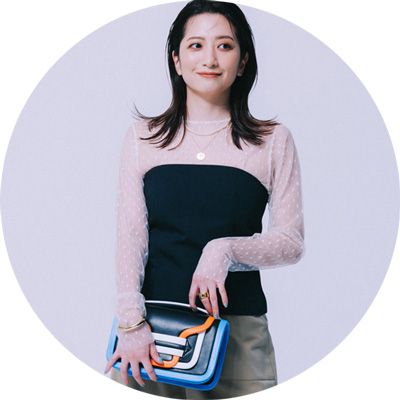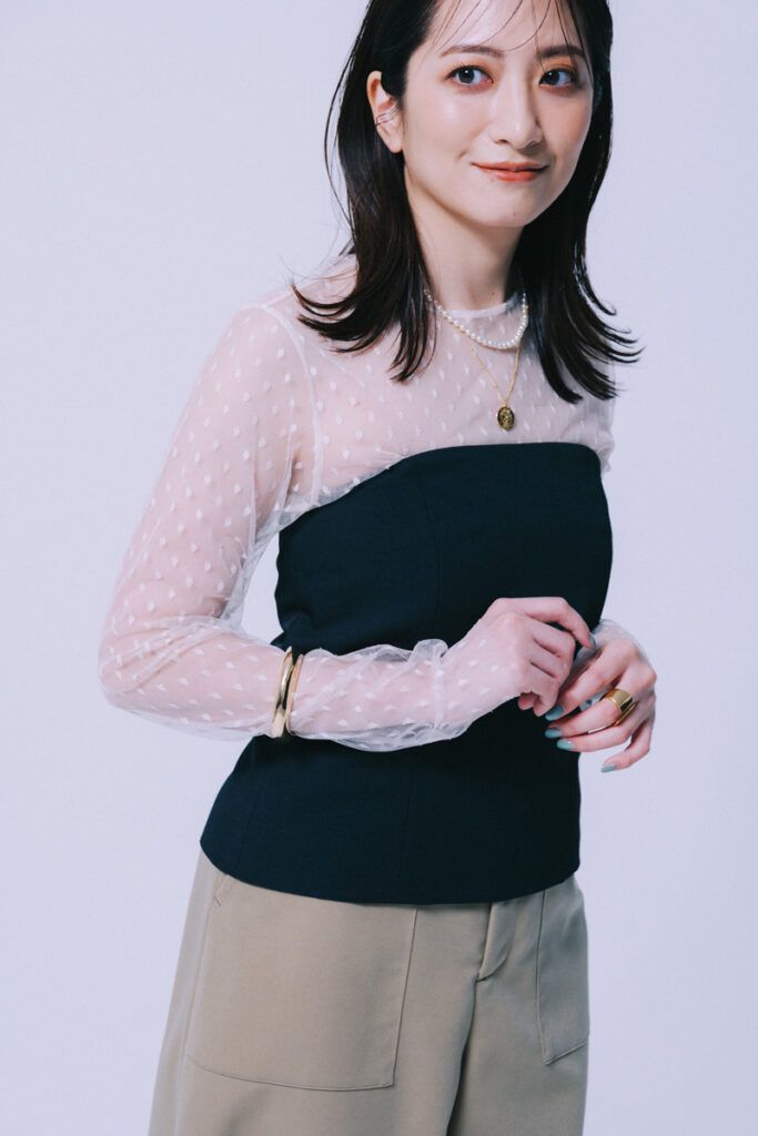 会社員時代の服選びで重視していたのは、何よりもまず“アナウンサーとしての見え方”。仕事では清潔感があって、露出が少なくて、誰に対しても好印象を与えるものを着ていましたし、プライベートもシンプル系がメイン。トレンドっぽいアイテムとは縁がなかったですが、これからは着るものでも自分を表現していきたい! 雑誌などでよく見るシアートップスに挑戦してみたいです。