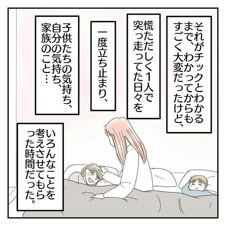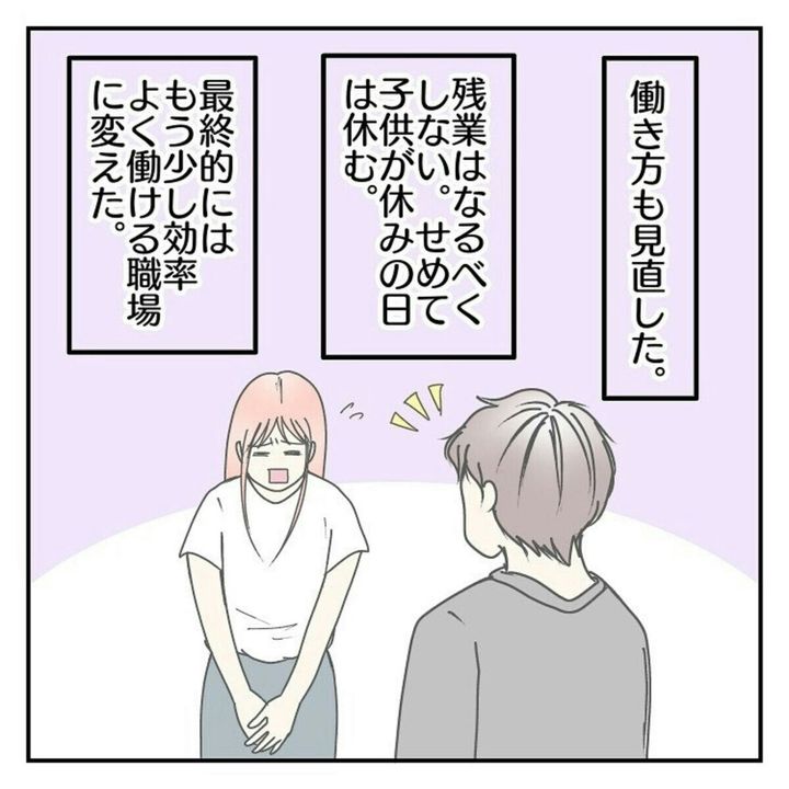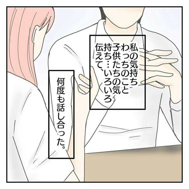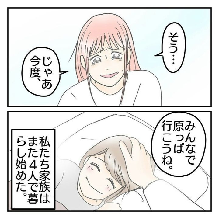 離れて暮らす夫との関係性を見直すことにしたねこじまさん。話し合いをするなかでお互い反省し、子どもたちのためにも関係を修復することにしたそうです。さらに、ねこじまさんは働き方を変え、なるべく子どもたちといられるようにしたそう。わっちちゃんの咳がきっかけとなり、家族のあり方や働き方まで変化があったのですね。