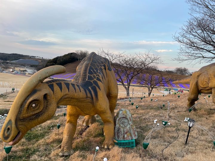 ライトアップは綺麗だけど恐竜が夜は怖いかもしれません。