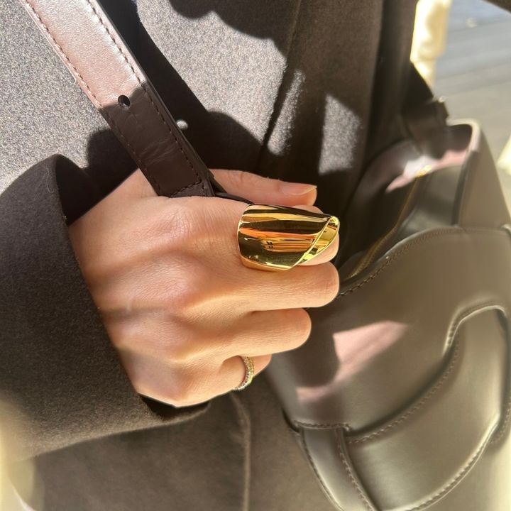 ちなみに、バッグと一緒にリングも発見。ポレーヌの表参道店の2階はジュエリーが陳列されていて、デイリーに使いやすいものばかりで素通りできませんでした……。試着した瞬間に指が柔らかく包み込まれ、持ち帰ることを決意させた絶妙なフィット感! 美しいドレープとボリューム感で、ニットにデニムのようなシンプルなコーデの時に超使えます。これまで邪魔になるのが嫌でジュエリーは華奢なデザイン命だったのですが、一気に価値観が変わりました。ジュエリーは全て手作業で作られているそうで、フォルムは繊細なのですが、真鍮に24Kゴールドコーティングした素材なのでプライスは控えめ。ホワイトデーにおねだりするのにも、心苦しくない価格帯でオススメですよ!