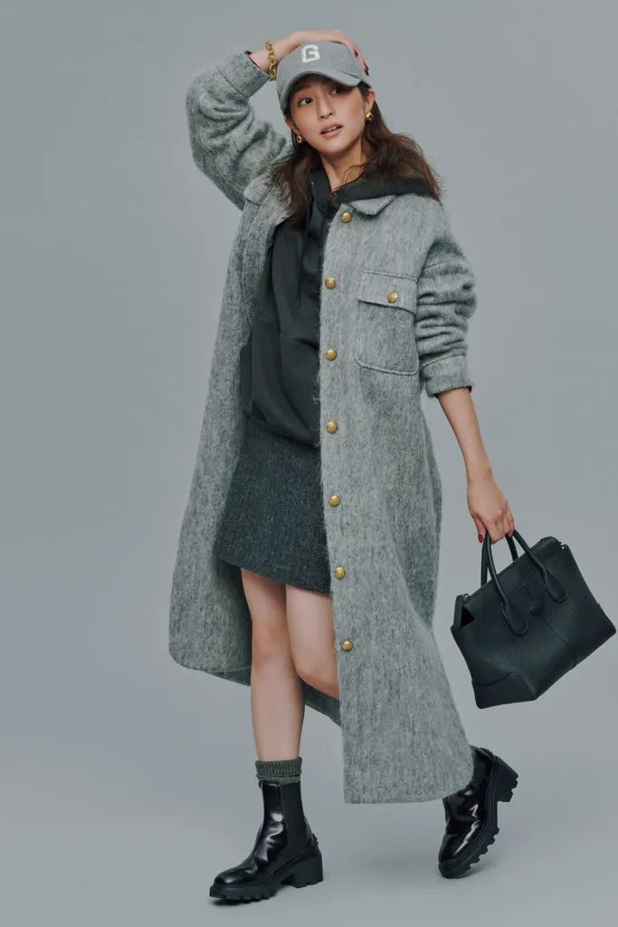 チャコールでまとめたインナーに、ライトグレーのアウター&キャップで軽やかさをトッピング。毛足の長いロングコートに、ミニ丈スカートを合わせるバランス感がオシャレ度を加速させます。カジュアル見えしがちなフーディも、足元の肌見せ感でほどよくレディな印象に。