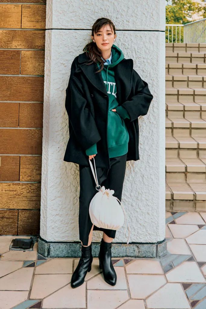 Pコートとトップスは、オーバーサイズでゆるっと合わせるのが今っぽく見えるコツ。フーディの中にブルーシャツを忍ばせれば、さりげなくきちんと感を演出できます。上半身が重ためなぶん、足元をほどよく肌見せし、大人の抜け感を醸し出して。