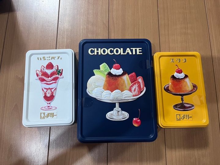 今年も可愛い缶が出てましたぁー!!美味しいチョコで有名なメリーからでている♪はじけるキャンディーチョコレート♪たまりませんねぇ〜このレトロな缶♪今回は大きいサイズのアソート缶とミニサイズのいちごパフェとプリン缶を購入してみました。
