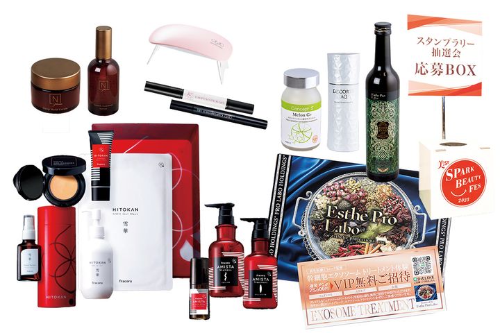 ハーブザイム113グランプロ、幹細胞エクソソームトリートメント無料ご招待チケット(エステプロ・ラボ)、ホワイトCエッセンスローション(ララビュウ)、コンセプトエスメロンジープラス(ドクタースパ・クリニック)、美STコラボ色チャームスティックジェルプチスターターセット(ミニUVライト付き)(SEVEN BEAUTY)、スムーストリートメントローションとディープホールドクリームのセット(Nオーガニック)、ホリデイスキンケアキット(フラコラ)、を抽選でプレゼント。