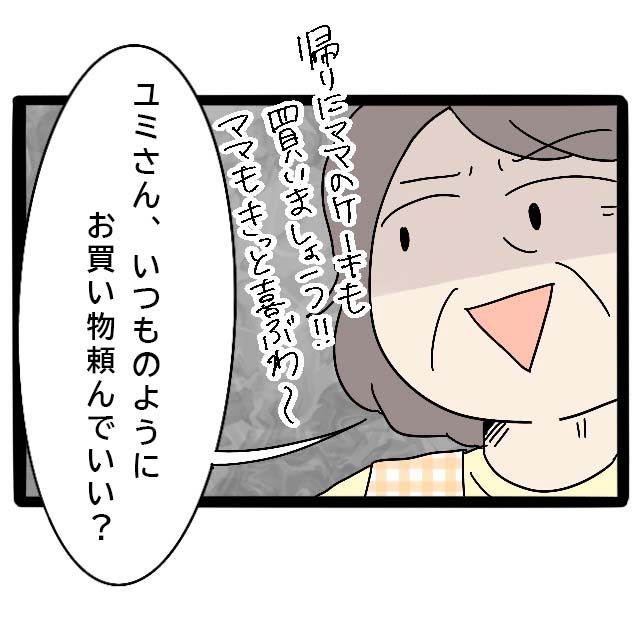自分の家族だけでお出かけがしたい義母は、いつもユミさんには買い物を頼んで自分たちだけで出かけるのです。
