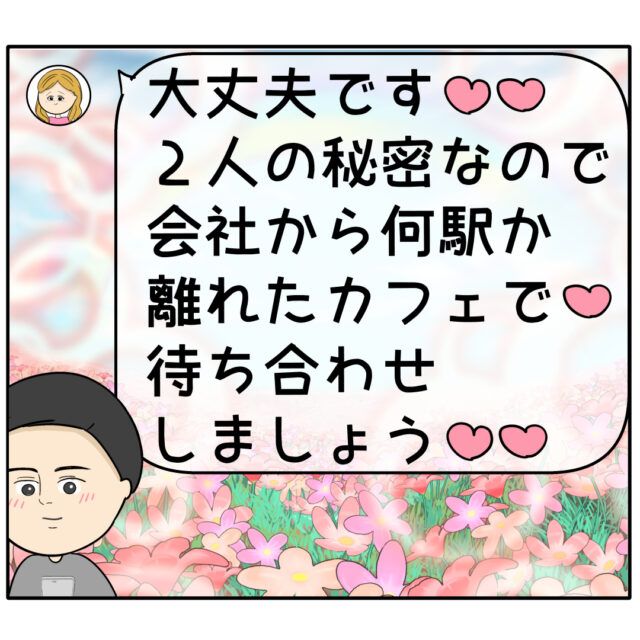 2人の秘密なので、会社から何駅か離れたカフェで待ち合わせしましょうハート」
