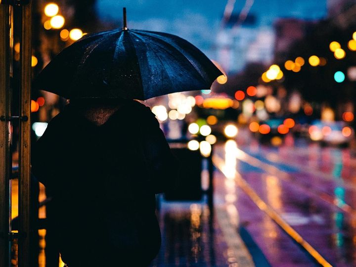 雨の中、夜景がじんわりと光って浮かぶ。