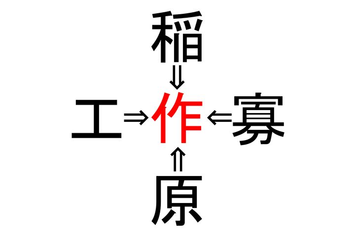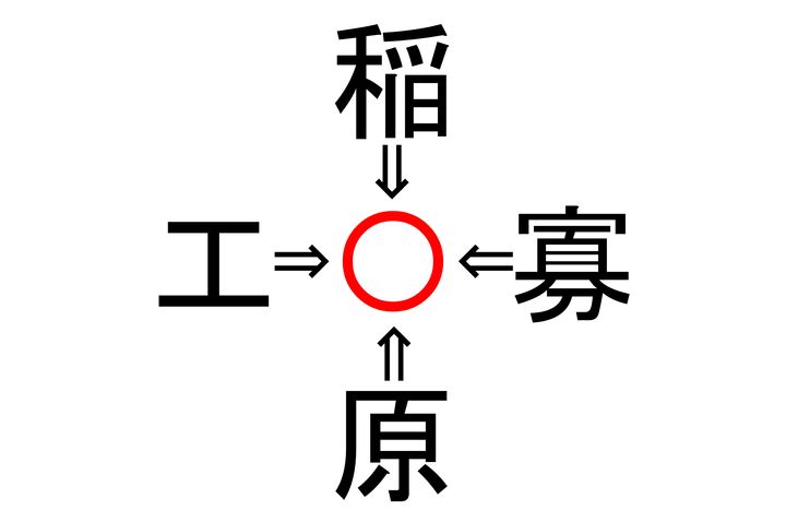 稲〇・寡〇・原〇・工〇。 4つの〇に入る漢字は共通しており、それぞれ熟語を形成します。