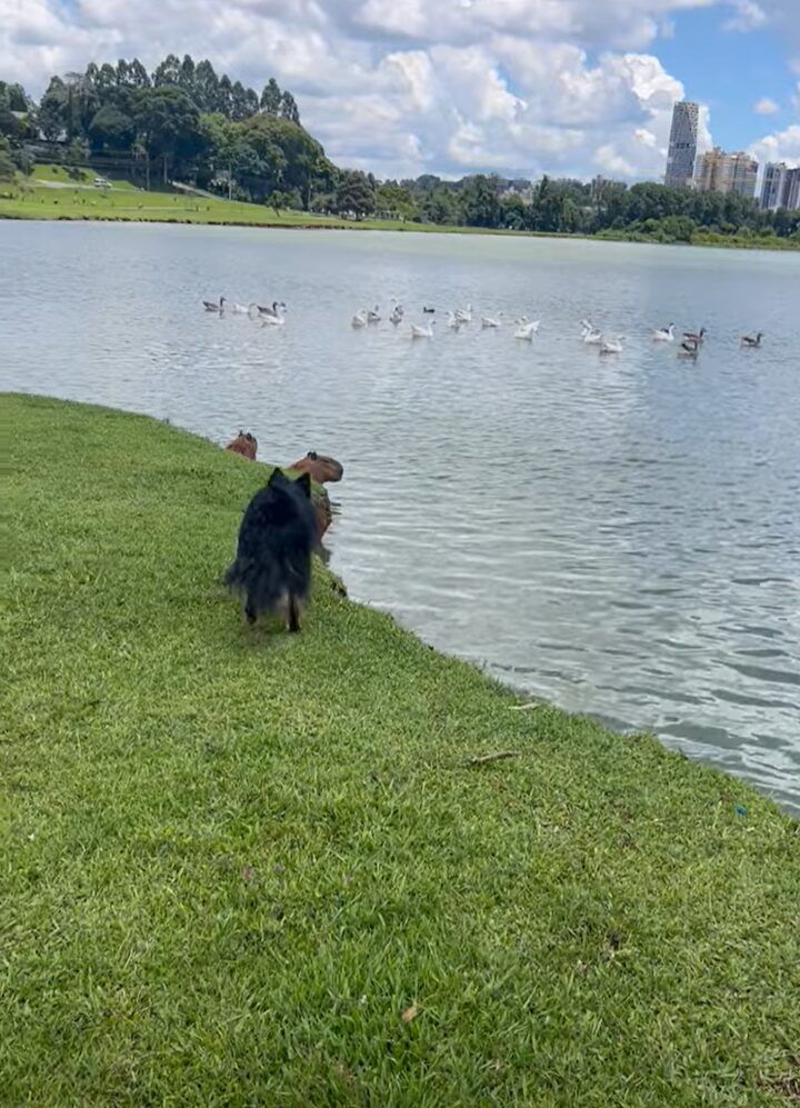 公園を散歩していると、愛犬たちは前方にカピバラの姿を発見! 一緒に遊ぼうと思ったのか、さっそく忍び足で向かっていきますが・・・。