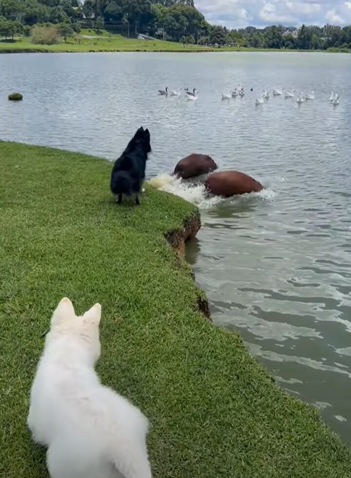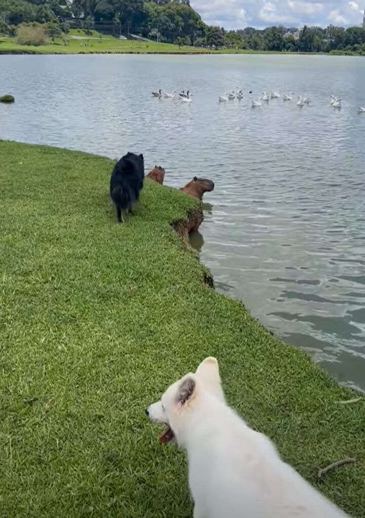 3. 公園を散歩中の愛犬たち。目の前にカピバラたちがいるのを見つけてひっそり近寄りますが・・気付かれちゃった!!【海外・動画】