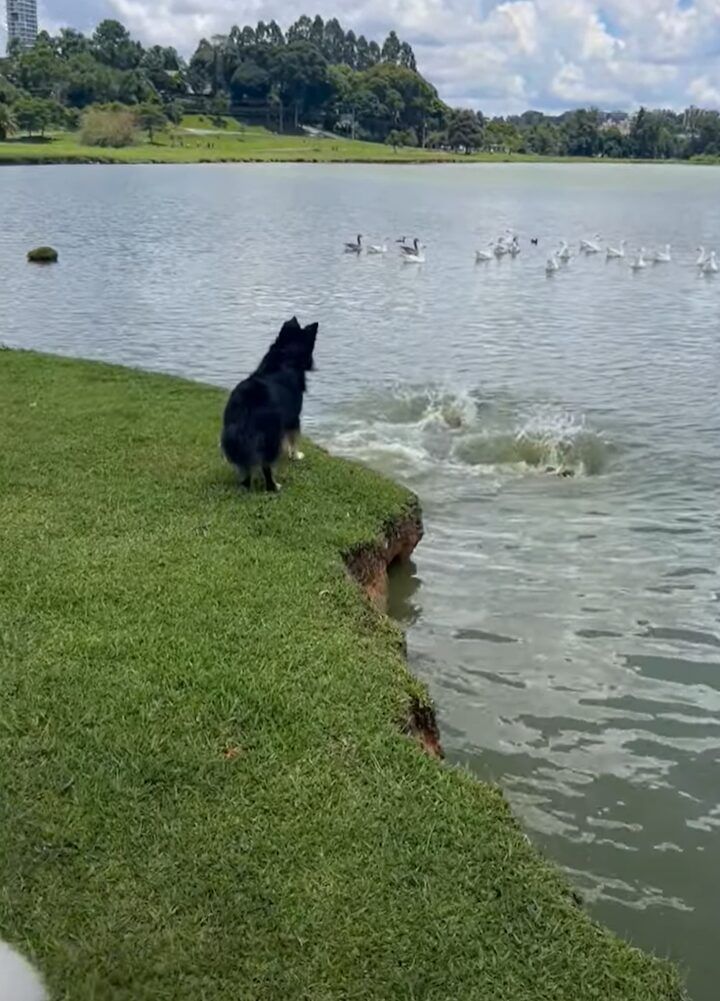 ところが、気配を察知されたのか、カピバラたちが水中にダイブしてしまいました! 思わず、愛犬は「バウっ」と吠えてしまっています。