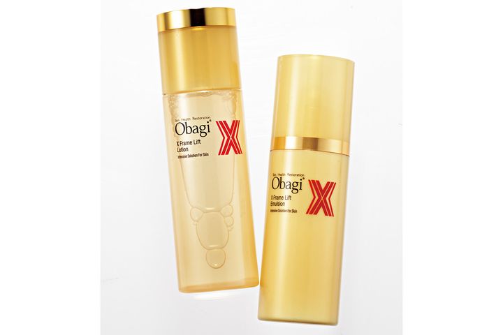 重力に抗う抗力を強化するフレームリフトコンプレックスをナノカプセル化して、それぞれに配合。微細化したオイル入りのとろみローションと、複数のオイルをブレンドしたコクのある乳液でふっくら艶肌に。2つを重ねた時のスッと馴染むテクスチャーも絶妙。2STEPで約1万円だから毎日たっぷり使える。左から:オバジX フレームリフトローション 150ml¥5,500、同フレームリフトエマルジョン 100g ¥5,500(ともにロート製薬)