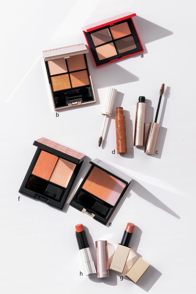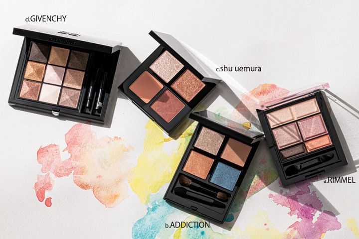 a.ツヤと透け感のあるショコラカラー。オイル配合のしっとりパウダーが密着して、つけたての美しさが続く!ワンダー スウィート アイシャドウ 006 ¥1,760(リンメル) b.まぶたに溶け込みながら、ヘルシーな血色を与えるオレンジベージュ。アディクション ザ アイシャドウ パレット 108 ¥6,820※限定品(アディクション ビューティ) c.サクラティー ベージュやホウジチャ ブラウンなど、茶道から着想を得たカラー。クロマティックス クワッド アイスカルプト アートオブティー¥7,150(シュウ ウエムラ) d.ゴールドを主役にした、ベージュブラウン系の9色パレット。華のあるエレガントな目元に。ル・ヌフ・ジバンシイ No.07 ¥8,360※限定品(パルファム ジバンシイ)