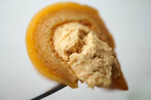中のクリームはちょっと褐色。真ん中には黒蜜らしきものが見えています。おもちと黒蜜はまさに「桔梗信玄餅」のイメージ通り。さて、肝心のお味はどうでしょう?早速、実食してみましょう!